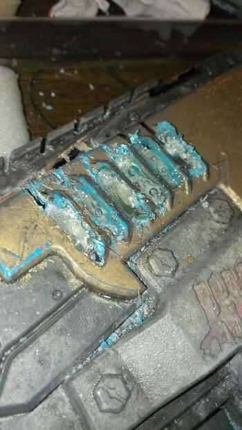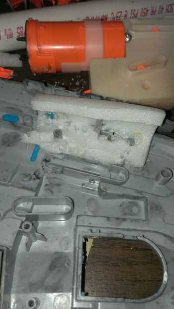 Ahora usando tu espuma, cubrir los agujeros sólo se cortan en el interior. La espuma con una pistola de pegamento caliente del derretimiento si usted necesita para asegurarse de que ajusta el funcionamiento interno. También, usted puede poner una capa fina de pegamento caliente sobre la espuma para una mirada brillante líquida fresca.