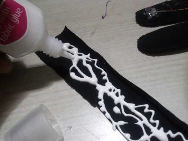 Aplique una cantidad abundante de pegamento para tela tanto, guante, así como el pedazo de tela y unirse a ellos.
