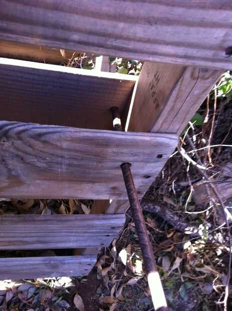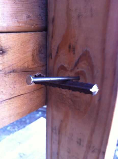 4) si no hay ninguna placa posterior para apoyar contra, puede utilizarse un clavo de enmarcar solo d 10. Martillo ~1/2 forma en 2 x 4 en el ángulo derecho para sujetar la varilla en ángulo hacia arriba. Martíllelo ángulo hacia abajo para darle más resistencia.