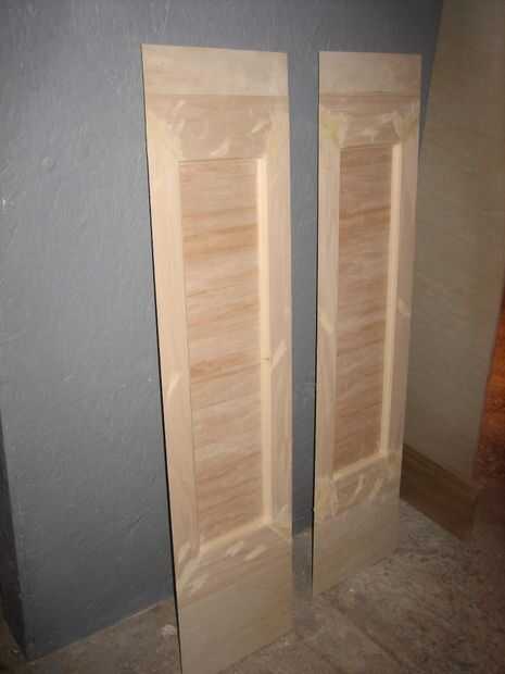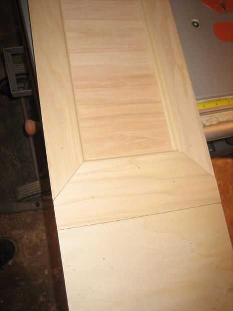 Empecé con un pedazo de 1/2" madera contrachapada del álamo en esta dimensión determinada. Además de esto básicamente construí un marco con tiras estrechas de madera contrachapada de 1/2". Los lados son 1 3/4" de ancho, mientras que la parte superior e inferior son 5" de ancho. Dentro de este marco, he instalado algunas molduras de almacén comprado. Este moldeado cubre el borde de la madera contrachapada, así como crea la transición en el panel inferior. Lo que me quedo con es la mirada de un panel levantado. El área restante en la parte superior e inferior se rellena con madera contrachapada de 1/2". No importa la costura será cubierto por moldeo en un próximo paso. Se cortó un ángulo de 45 grados sobre cada lado largo de los paneles de todos los agujeros del clavo y se abordaron los huecos con masilla para madera.