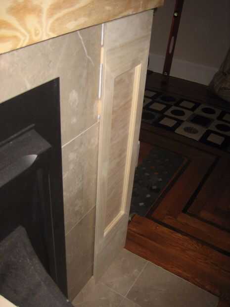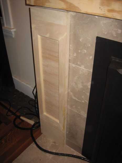 Por último fue el panel lateral interno. El borde delantero obtiene un 45 grados corte para mate con el panel frontal. El borde posterior quedo recto como se sienta la flush contra el mármol surround... otra vez sólo escapó para arriba en ese corte hasta que me hicieron el ajuste apropiado.