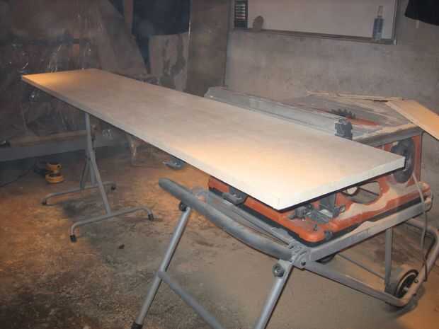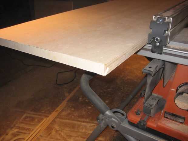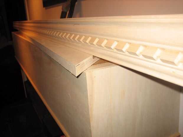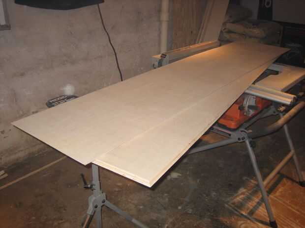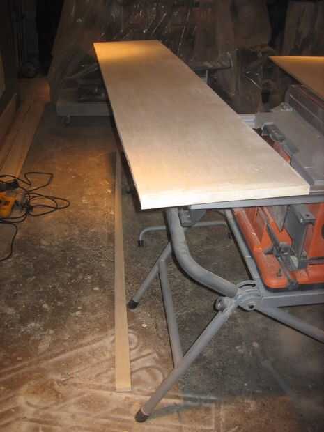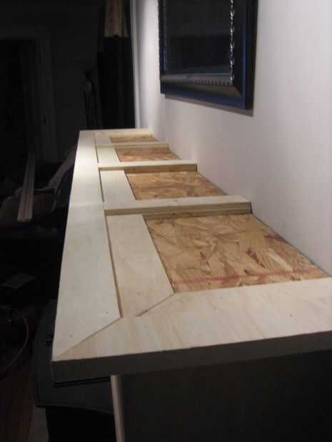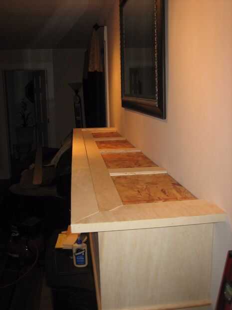 La capa superior se hizo cortando al hilo de la segunda hoja de madera contrachapada en mitad, los bordes expuestos tres de corte a 45 grados, laminar y repitiendo el proceso de borde demasiado complicado triángulo. Profundidad final fue cortado en la Sierra de mesa una vez seco el pegamento. Se describen a continuación a la pared, pero acabado las dimensiones son aproximadamente 85 "x 16". Como con todo lo demás, esto fue unida con pegamento y brad uñas.