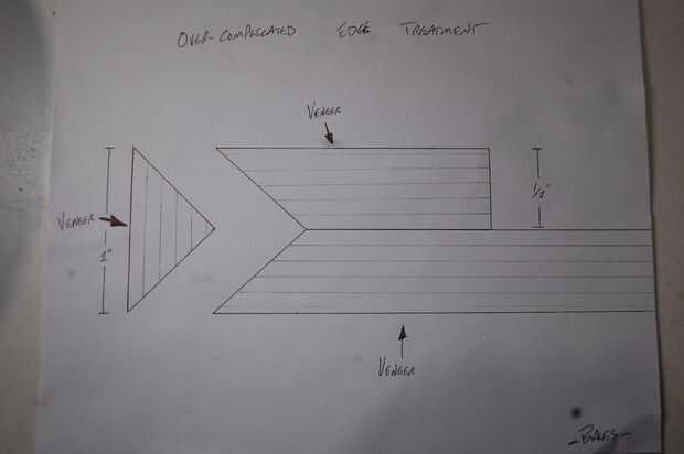 No veo el punto de perder toda una hoja de madera contrachapada para la capa inferior... aka yo soy barato. Mi método era laminar una sección amplia de 4" en una 8" amplia sección... darme 1" de espesor. Tratamiento de los bordes expuestos con bandas no sido el método más fácil, pero decidí complicar más el proceso. Antes de pegar estas capas, corté los bordes hacia fuera a 45 grados para terminar con una boca de aves o una abertura triangular. Para llenar ese espacio he utilizado otro pedazo de madera contrachapada ripeada en un triángulo con el lado de la cara que la chapa de madera de álamo. He hecho un dibujo muy pobre en un intento de hacer sentido a mi locura.