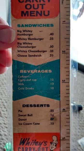 Me encanta el menú marcador medición viejo, que había encontrado entre la colección y luego laminado para protección. Una gran Whitey hamburguesa de 40 centavos, una rebanada de pastel para un cuarto y un café en una copa para 15 céntimos realizar. ¿Te imaginas? Todo eso por menos de dólar!