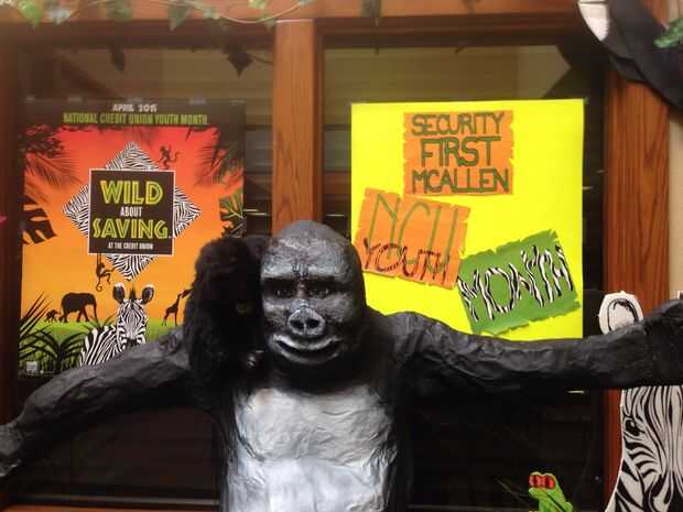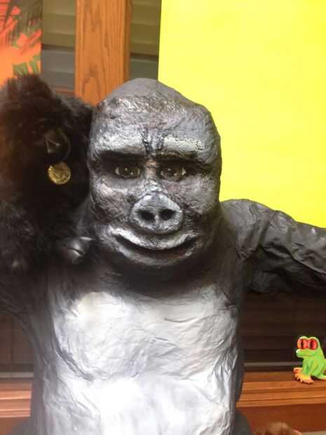 Usé un accesorio de barril reciclado y tiene placas de cartel tres dólar tienda a trabajar en el ambiente para el gorila.