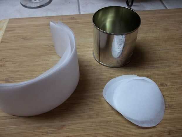 Luego corte tiras de pergamino que llenará a los lados de la lata, como se muestra. Una vez que has cortado las piezas, añadir el papel de forro.