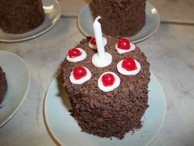 Cargar una manga pastelera pequeña con glaseado blanco. Utilice un pequeño Consejo o simplemente cortar la punta de la Manga pastelera. Añadir la guinda blanca alrededor de las cerezas y la vela, para hacer esto, simplemente tubo un "blob" inflado de helar alrededor de la mitad una pulgada a través. Hacer que el blanco hielo gotas bastante altos, ya que tendrán que disimular los extremos cortados de las habas de jalea. Tubería de uno de ellos en el centro y 6 alrededor de los bordes como se muestra. Por autenticidad, estos pasteles deben tener 8 cerezas, pero con el tamaño de las habas de jalea y la Magdalena, 8 cerezas cubiertas demasiado de las tapas.