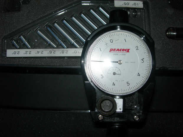El destello de flash bastante que mucho obscurece el disco secundario (un poco más arriba y a derecha de '4') es importante como dice cuántas revoluciones del dial principal (con puntero largo) ha hecho. Foto del calibre de 'cero' no era demasiado difícil ya que no tenía que preocuparse por deslizamiento de yunques micrómetro (sé, ha ' apagado por 1/10.000", el ajuste real es correcta.