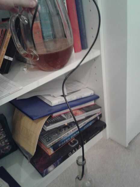 Nota: un sifón es un tubo de sólo. Puede utilizar un sifón, pero un trozo de cable eléctrico con las entrañas hacia afuera es lo suficientemente bueno para mí. Sólo mientras esté limpio!