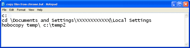 El primero es crear la carpeta de destino para los videos. Esto puede ser cualquier lugar. Para este ' ible, se hizo "c:/temp2." Después de crear esta carpeta, cree una subcarpeta denominada "No borrar" en él. En esa carpeta crearemos un archivo por lotes llamado "copia archivos de chrome.bat" uso notepad.exe para crear el archivo. Si no sabes cómo crear uno, tomar algunas vez a Google. Son muy fáciles de hacer y es una gran habilidad para tener.