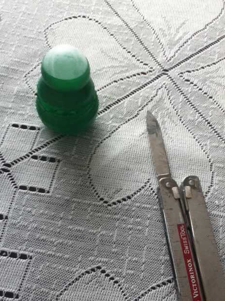 Ok así que tenemos la bola de desodorante roll-on para que tomamos nuestro cortador y simple corta la parte superior de la caja de dedorant donde la bola es. No debe ser necesario perfecto en el corte