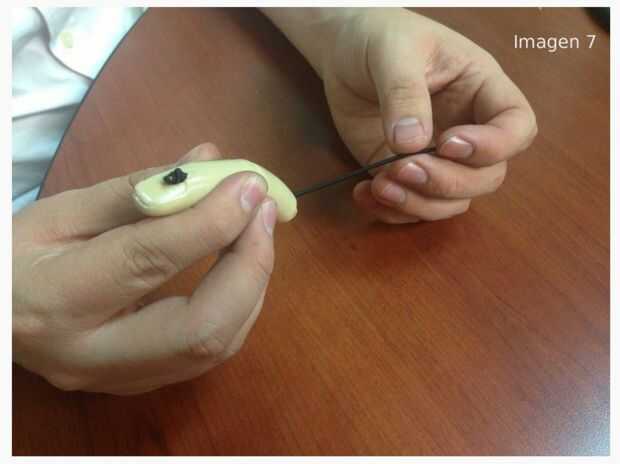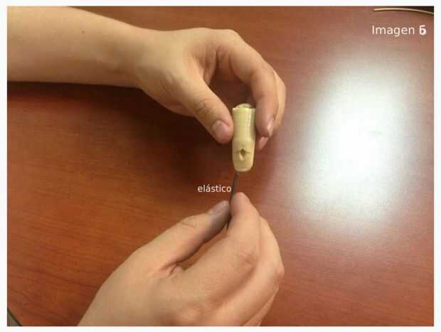 - Empujar el elástico a través del conducto formado entre las falanges del dos, hasta asome por la base de la falange proximal. Imagen 7 Antes de unir los dedos a la palma, se debe insertar los elásticos dentro de los dedos.