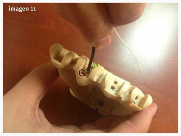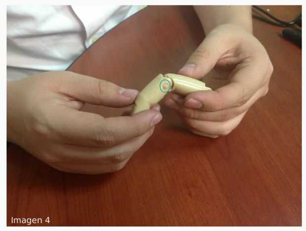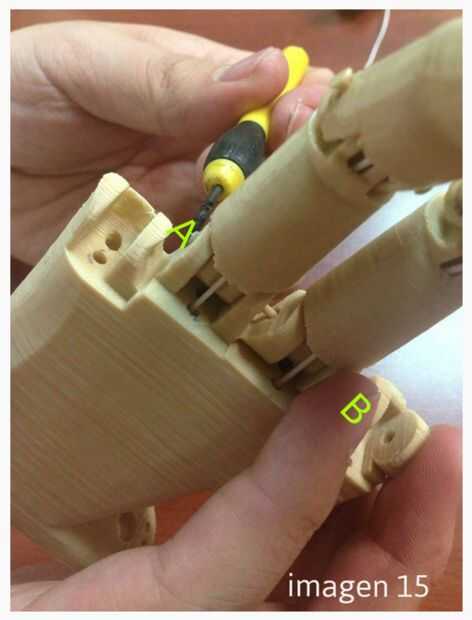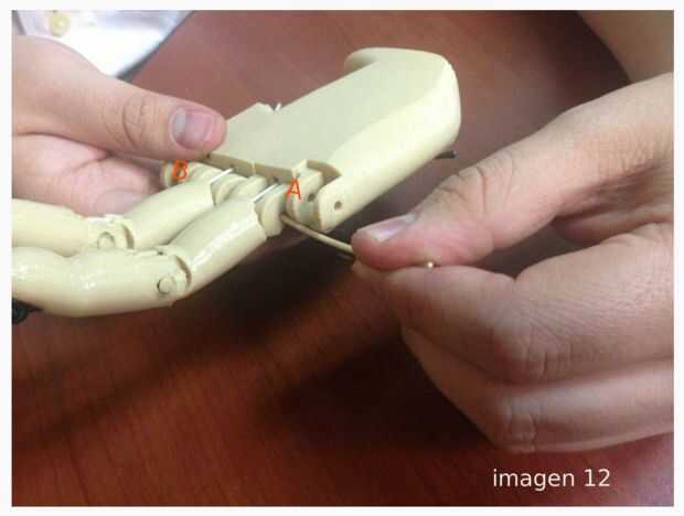 - Montaje el filamento de A B para formar el eje de rotación/articulación entre la falange proximal y la palma del dedo medio y anular. Imagen 12