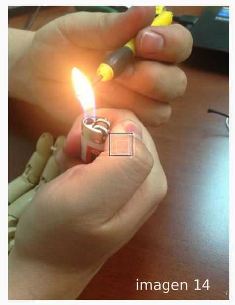 - Montaje el extremo del elástico del dedo meñique en el agujero G del respectivo ¡ receso de la palma. Montaje el filamento EF para formar eje de rotación del respectivo dedo. Derretir los extremos del filamento EF siguiendo la misma técnica del primer eje de rotación. Los dedos deben de quedar de la siguiente manera Imagen 16