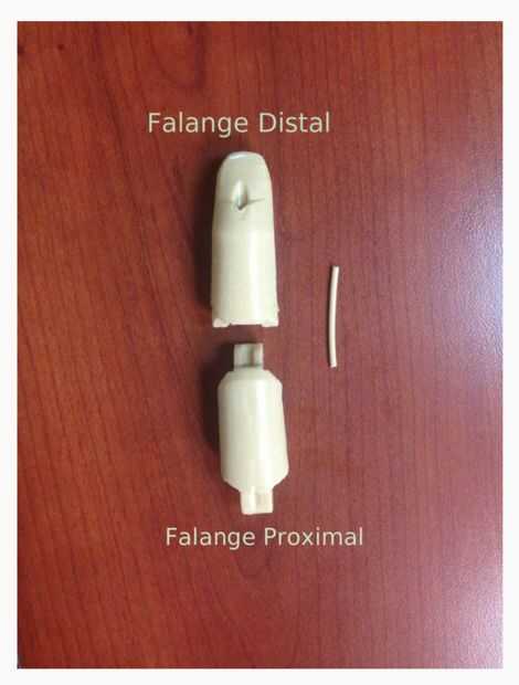 - Recortar un pedazo de filamento del ancho de la falange distal + 6 mm para cada dedo. Montaje el filamento en los agujeros de ambas falanges para unir las dos piezas Imagen 1.