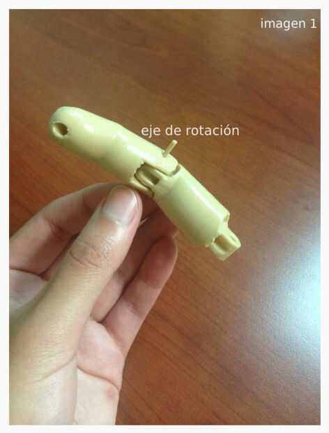 - Montaje el extremo del elástico del dedo índice en el agujero G del respectivo ¡ receso de la palma. Montaje el filamento CD para formar eje de rotación del respectivo dedo. Derretir los extremos del filamento CD siguiendo la misma técnica del primer eje de rotación.