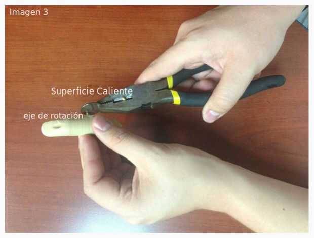 - Respuesta los pasos anteriores en el otro extremo hasta los extremos derretidos del filamento queden en contacto con la superficie externa del dedo y mantengan el eje de rotación en su posición. Imagen 4