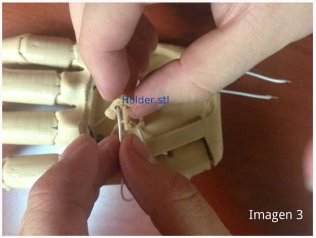 2. Para los dedos cierren en sincronía hay ajustar los hilos simplemente rotando la pieza soporte. STL la cual es una por cada dedo. Imagen 3