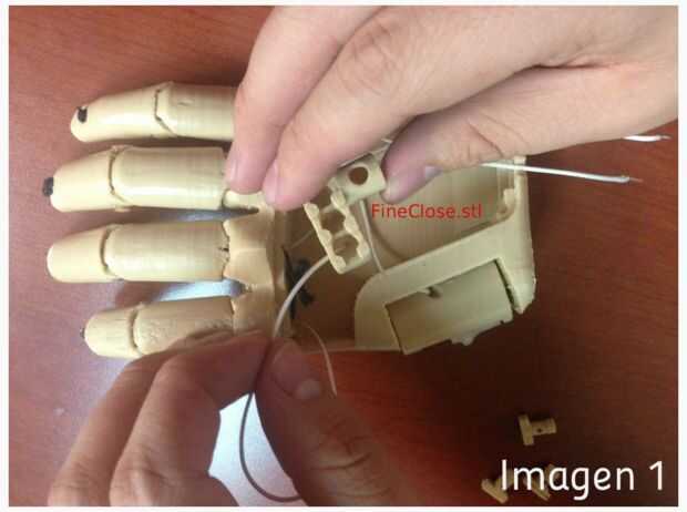 Para flexionar los dedos es necesario tensar los hilos de nylon. Se pueden jalar los 5 dedos al mismo tiempo para la mano cierre completamente la pieza FineClose.STL une los hilos de los dedos para al tirar del cable de freno de bicicleta los cinco dedos puedan ser flexionados y habilitar cerrar los dedos el tiempo se desee cerrar los dedos de la prótesis