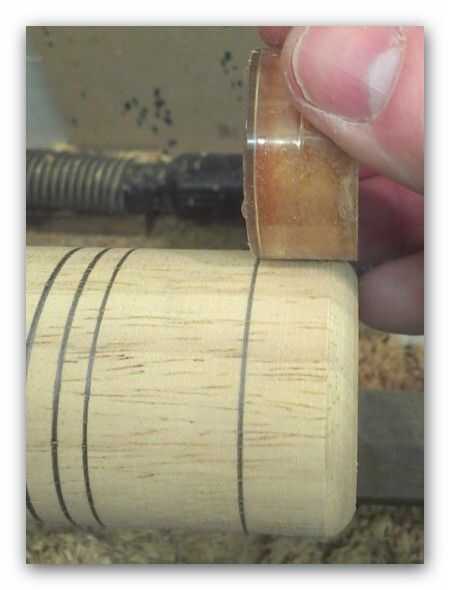 Tomar una de las luces de té y marque su profundidad en la parte exterior de la madera. Encender el torno y trace una línea a la profundidad marcada, a continuación poner líneas adicionales en puntos a lo largo de la longitud en youo desea que la forma de cambiar.