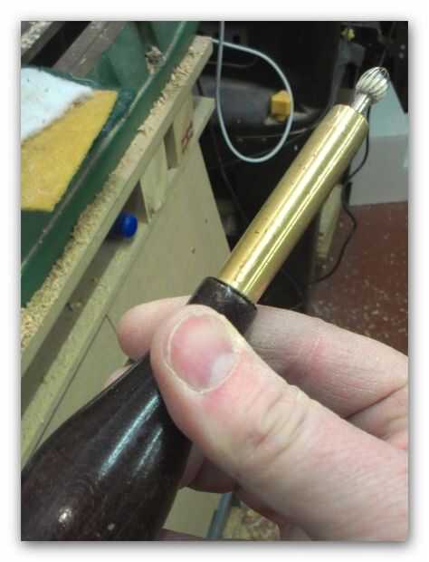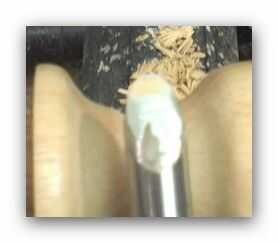 Nota: si se corta ligeramente en ángulo al quitarse el torno tendrá menos efecto para quitar la punta pequeña de madera cuando por fin sale a la izquierda. Esto también significa que la vela estará a nivel de su base.