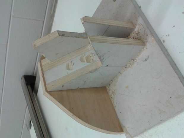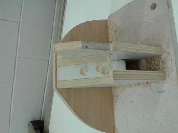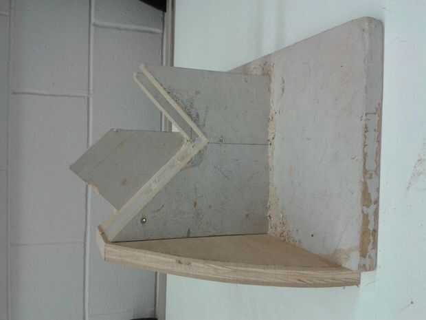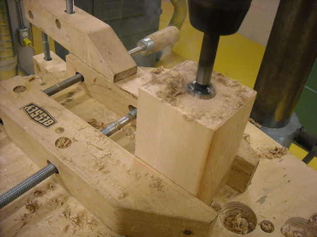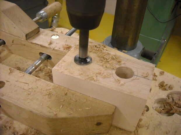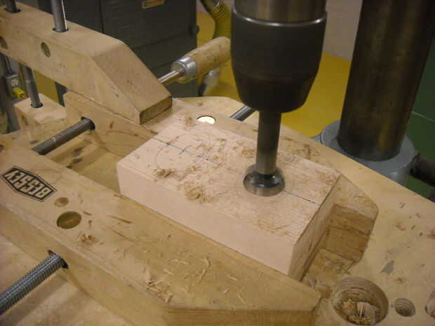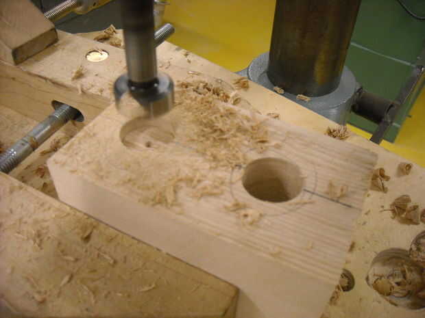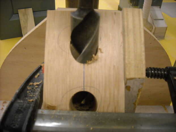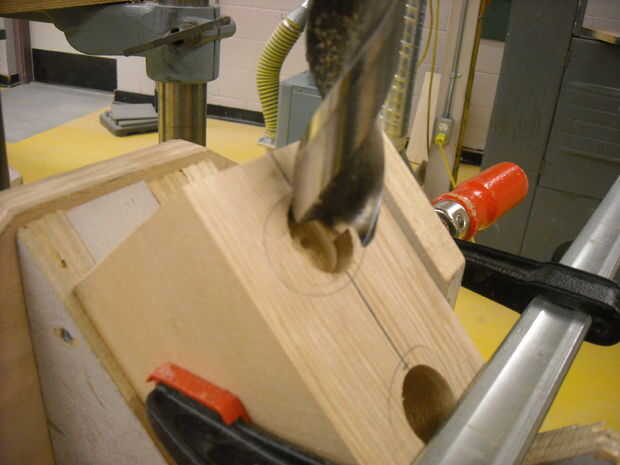 He construido una plantilla que tiene el bloque con un ángulo de 45 º para el taladrado de boca larga. También lo que funciona bien es girar el taladro de la base de 90 grados y abrazadera del bloque en el ángulo correcto de 45 º. Yo también he visto cuñas simple hechas pero recuerde que usted está tratando con un 1" broca conectada a un motor grande siendo controlado por un niño. Así hagan prueba de estudiante!