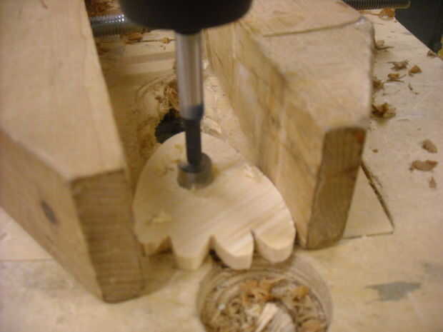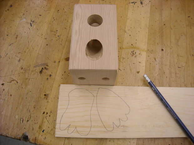 Mi método básico para la fijación de las piezas es utilizar una pieza Forstner del mismo tamaño como la espiga que estoy usando. En los dibujos he perforado 2 orificios en la parte inferior del bloque para las piernas... el mismo tamaño del agujero es en los pies. Esto funciona bien porque se pueden pegar los tacos sin ser fondo en sus agujeros... permite que los niños que no tienen coincidencia perfecta pasador longitudes.