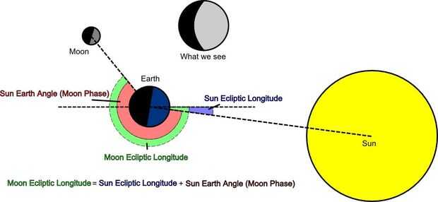 Longitud eclíptica de la luna se encuentra con sólo agregar longitud de eclíptica del sol con el ángulo Sol-Tierra-Luna (es decir, la fase lunar).
