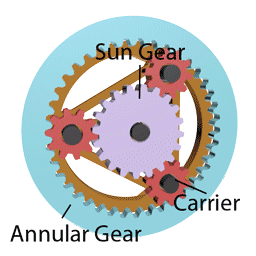 Engranajes planetarios son un poco más complicados. Constan de un engranaje de centro (el engranaje del sol) que está rodeado por varias pequeñas "engranajes de planeta" que a su vez están conectados a una base común (el portador). El sistema entero está rodeado por un engranaje interno (el engranaje anular). Sé que esta es una explicación pobre, pero debe poder obtener la imagen al observar en la figura adjunta.