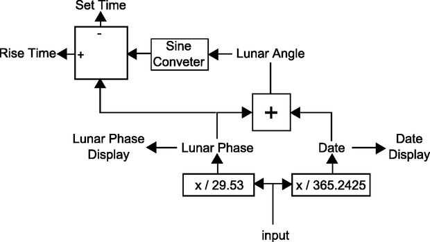 Entonces se añaden la fecha y la fase lunar para obtener el ángulo lunar, que a su vez se convierte en una señal sinusoidal.