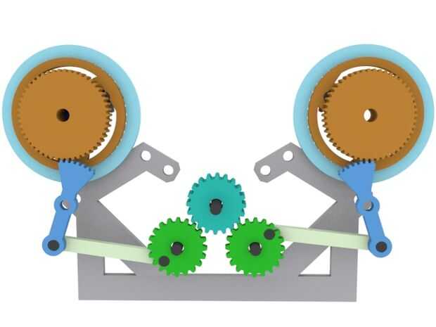 La conversión de seno es mostrar en la primera figura. Básicamente una rotación completa del engranaje del teal (eclíptica ángulo de salida) se convierte en un período sinusoidal. Entonces esto se convierte en parte posterior-y-adelante-rotación del engranaje marrón, que corresponde a una desviación de +-3 horas. Números de dientes: