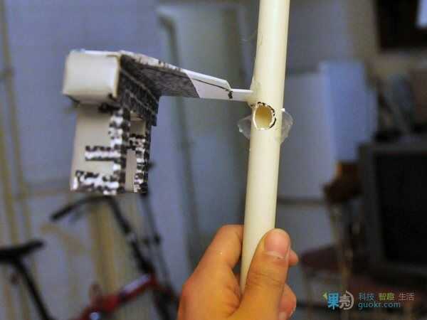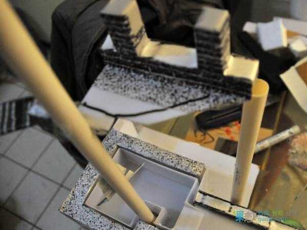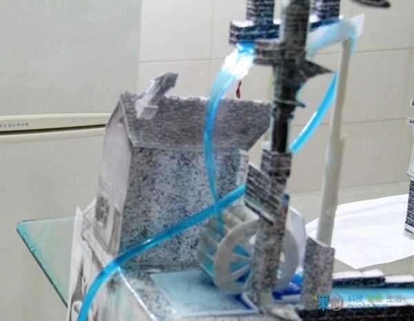 Dos tubos de PVC se utilizan para configurar el punto de descargando de la cascada. El lugar de la conexión fue pegado con gel caliente sol. Debemos asegurarnos de que el tubo de PVC en el lado derecho debe ser bloqueado por el uno en el lado izquierdo de la observación. Esto es para evitar ser visto a través.