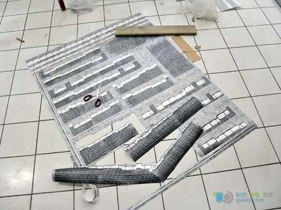 Para mantener nuestro plan bastante simple, usamos Photoshop en lugar de trabajo de pintura de mano inestable. En primer lugar seleccionar las piezas de textura en la obra original. Luego ajustar tamaño y perspectiva de las piezas solicitadas. Finalmente imprimir la textura sobre vinilo de resistir el agua.