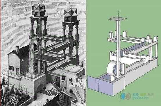 en establecer el modelo, utilizamos la función "Foto de partida". Consideramos que la obra de Escher como una imagen que tome del edificio desde un punto de vista. Luego usarlo como fondo para establecer un modelo 3D exacto como el edificio en la imagen de fondo.