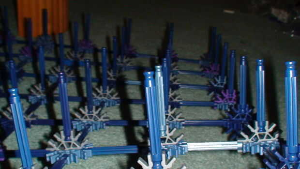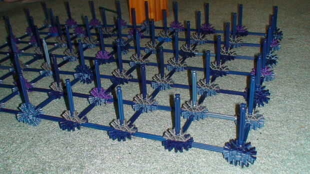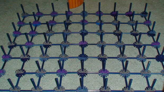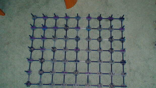 Ok este es el marco. Decide cuán grande su máquina será, mina es 9 x 7 sólo para hacerle saber. Poner barras azul permanente hacia arriba en las partes "3d" y conectar todo con varillas azules.