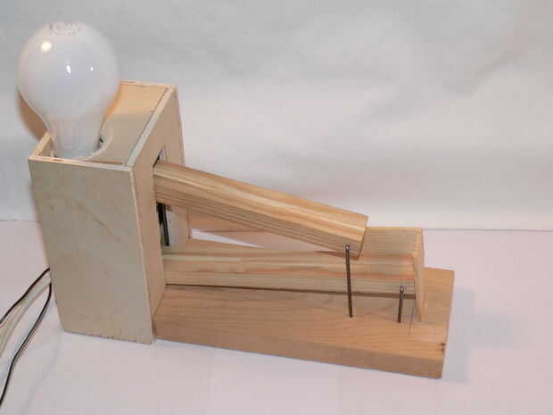 En primer lugar, se le cae la bola en una de las rampas. Cuando llegue a la parte inferior, un emisor/detector de IR "ve" que está allí y envía 5 voltios a la base de un transistor, que a su vez, dispara un relé. Cuando las salidas de relé vuelca energía de condensadores de alto voltaje en una bobina, que funciona como una pistola de bobinay tira a la bola hasta la primera rampa. Luego repite el proceso.