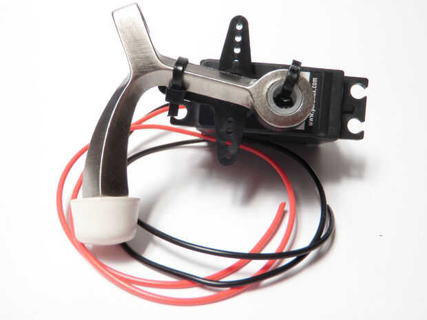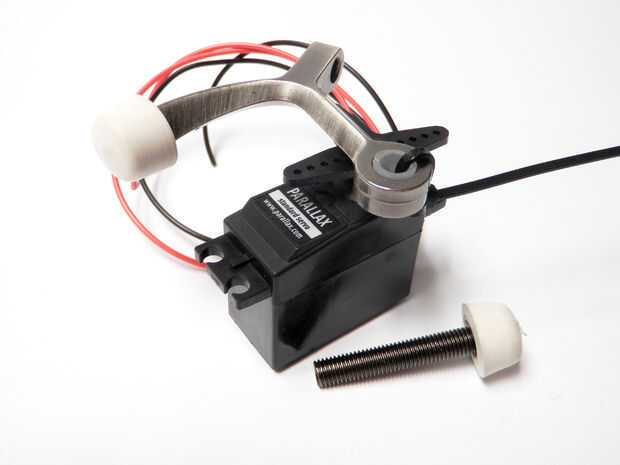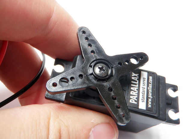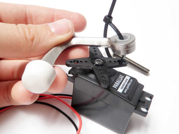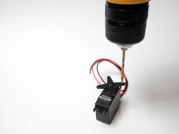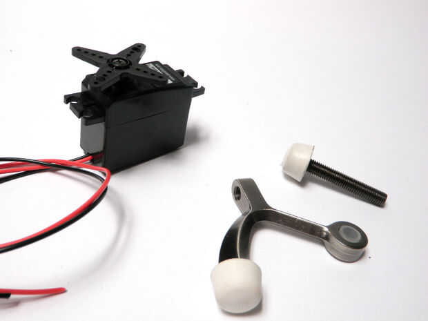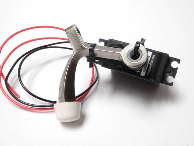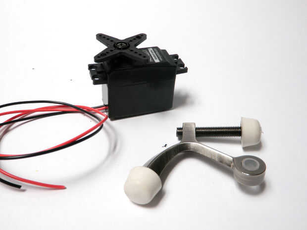 Fijar su tope de puerta a su cuerno del servo (la parte de aspecto de engranaje) con abrazaderas de plástico. Esto puede requerir taladrar agujeros más grandes en el cuerno del servo.