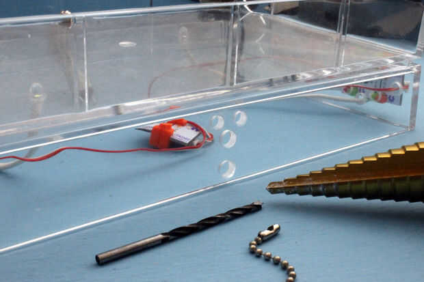 Haga dos orificios en una línea horizontal en la parte frontal de la bandeja inferior, justo en el medio, hacia el borde superior, aproximadamente 7/16" apart en el centro. Comience con un orificio piloto de 1/8" y ampliar a 3/16".