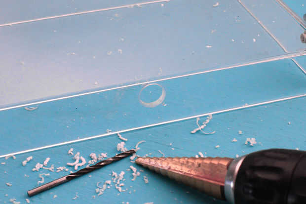Cuidadosamente y con paciencia ampliar el piloto de 1/8" agujero hasta 5/8" usando la broca de paso.