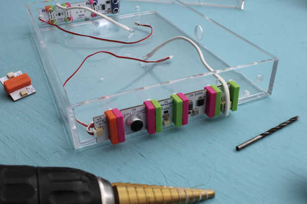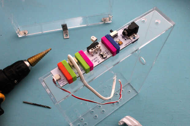 Instalar los Bits de "detección de cosas" en la cara derecha de la bandeja base. El largo del hilo de rosca cable LED y el cable de la punta de alambre por los orificios de enrutamiento, entonces encajan pies los Bits en la red de agujeros de montaje. Asegúrese de que el interruptor de rodillo que bit está establecido a "cerrar" modo.