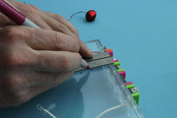 Mida y marque un centro de perforación en la parte superior de la base, de 1-3/16" en desde el borde de la mano izquierda, directamente en línea con el conector del PCB poco motor de vibración. Perfore un orificio piloto de 1/8" en este lugar y ampliar a 1/4" con su poquito de paso.