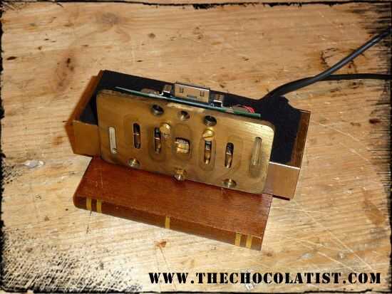 Para presentar la máquina en un llamativo y hasta carga y transferencia de datos reconstruyeron el acoplamiento de DELL de la estación. He utilizado latón, madera y metal para crear algo realmente steampunky...