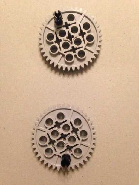 Usando dos engranajes de 40 dientes, coloque un conector negro como se indica. Estos conectores negros funcionará como levas y más pueden ser añadido o cambiado en la posición más adelante para crear diversos ritmos.