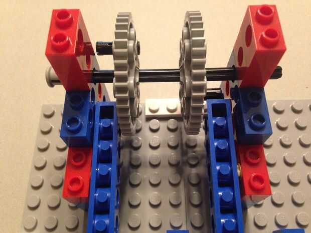Utilizando un árbol largo inserto en el tercer rayo de la parte superior, colocar los engranajes en el centro como se muestra.