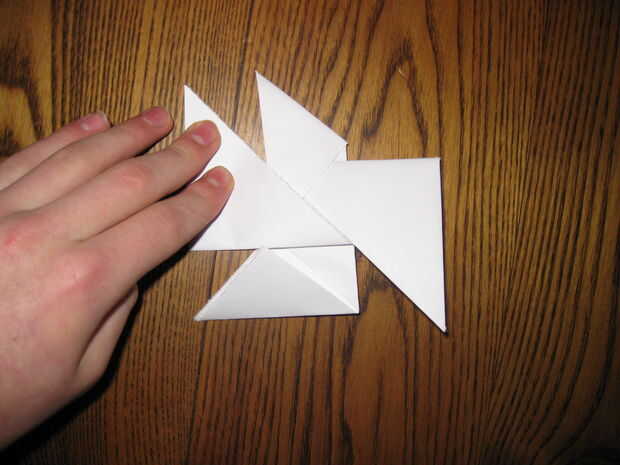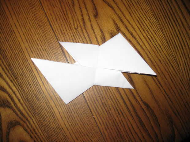 Doblar una esquina de la estrella en la abertura de la pieza opuesta, repetir en la misma pieza. A continuación Dale la vuelta y hacer lo mismo.