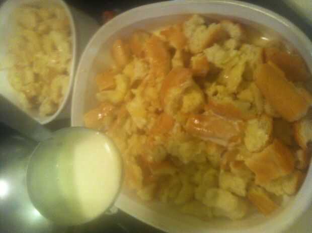Una vez disuelta, vierte la mezcla sobre el pan seco. Tómese su tiempo aquí, realmente quieres que el pan absorba la mezcla, añadir a casi toda la mezcla, conservar aproximadamente 1/2 taza. Si se desea, espolvorear con unas virutas. A veces deja la mezcla establecido por un tiempo!