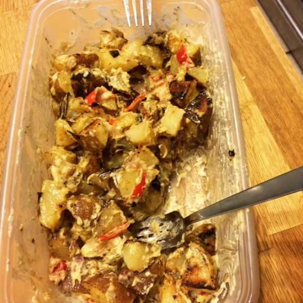 La mejor parte de este impresionante plato es la baja calidad de grasa! La mayo vegano no contiene una tonelada de grasa (sobre todo si mantienes el control de las porciones, que por suerte tengo) y no utilizo aceite en preparando las copas, para que pueda ir literalmente salvaje sin mayor culpa o indigestión. Bueno, la culpa todavía podría estar allí, pero te garantizo que no gana una libra ;)