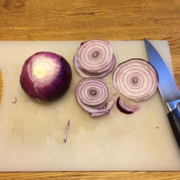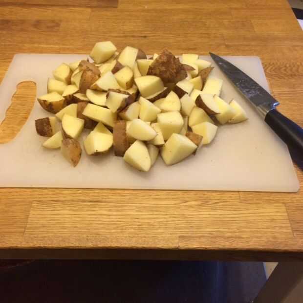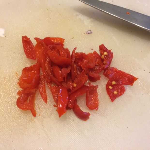Comience cortando y rebanando las verduras. Me gusta cuarto mi taters en trozos pequeños y rebanar mi cebolla en rondas de amor! Luego cuarto las rondas y mantener picarlos en trozos pequeños rectangulares. Además, picar los pimientos peppadew en tiras gruesas para la mezcla de vegenaise.