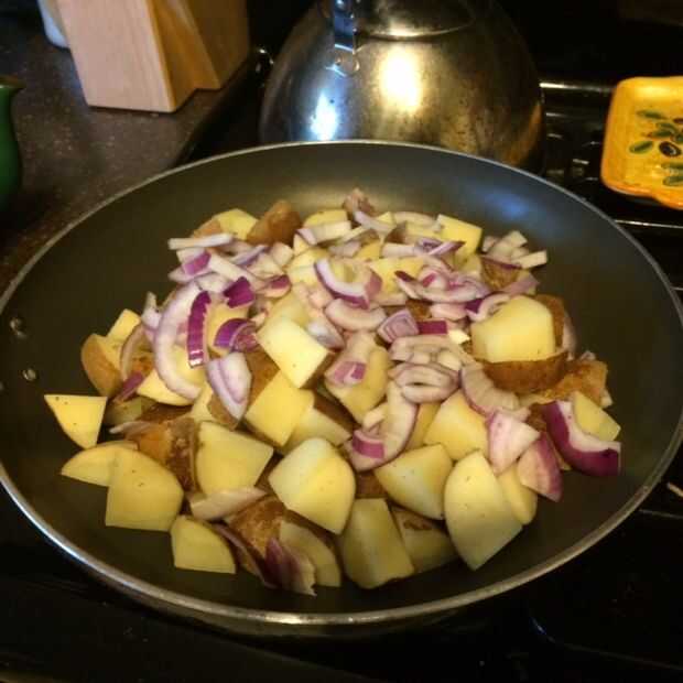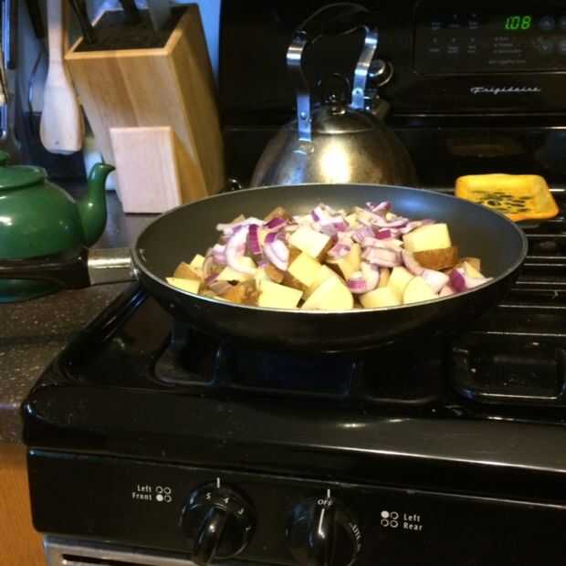 Mezcle las papas picadas y cebollas en el sartén precalentado. Establece en alto o alto/medio y coloque la tapa en la parte superior. De vapor por 20-25 minutos, comprobando en ellos cada 5 minutos.
