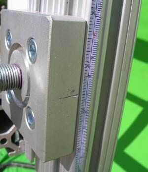 Puedes ver en la última foto cómo se encuentra la gota de soporte inferior. Un pedazo de una cinta métrica de una almacén del dólar cinta métrica ha sido pegado hasta el final de la estructura vertical. Una muesca ha sido presentada y firmado en el centro de la placa base como indicador.